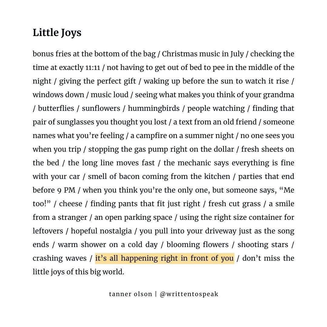 Thanks for sharing, Tanner. This was good! It made me think of Nouwen in his Prodigal Son book he talked about his friend that travelled extensively. Henri always looked forward to seeing his friend so he could get the exciting stories and news from him, but was always disappointed because his friend never had those kinds of stories to share. Instead, his friend would say, "I saw something very small and very beautiful; something that brought me much joy."